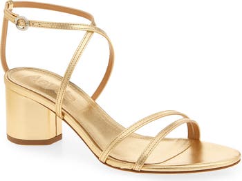 Wherever you go, shine in this Italian-made sandal topped with slender metallic-leather straps and boosted by a column block heel.