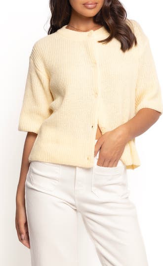 Heathery yarns bring sunny vibes to a relaxed cardigan framed by elbow-length sleeves.