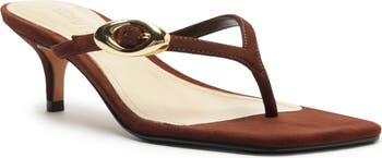 A gleaming oval button accents the adjustable strap of this leather slide sandal set on a low, kitten heel.