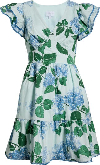 Scalloped trim details the tiered sleeves and flouncy hem of a playful floral minidress perfect for garden parties and events.