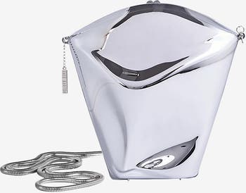 This mirror-finished abstract-shaped bag incorporates two lightweight outer shells and an inner shell for support with invisible magnetic closure. The interior is lined and includes a metal-plated 'KATE BARTON' logo. Interior can fit an iPhone (up to 16 Pro size), cards, lipstick, keys, wallet, etc. The purse includes a snake chain crossbody strap attachment. As seen on the New York Fashion Week runway and worn by Winnie Harlow. Dimensions: Bag dimensions: 8.4” Length x 8.4” Height x 1.75 to 3.8” Depth Strap Dimensions: 42” Length x 0.13” Diameter