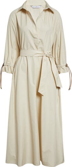 This oversized shirtdress is cut with smooth raglan sleeves from crisp cotton poplin and designed with a relaxed open half placket for an air of ease. The abbreviated sleeves are detailed with metal-tipped leather drawcords, while a wide belt cinches the waist to finish off the sophisticated look.