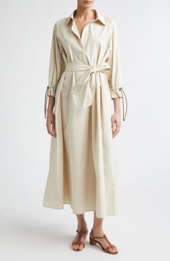This oversized shirtdress is cut with smooth raglan sleeves from crisp cotton poplin and designed with a relaxed open half placket for an air of ease. The abbreviated sleeves are detailed with metal-tipped leather drawcords, while a wide belt cinches the waist to finish off the sophisticated look.
