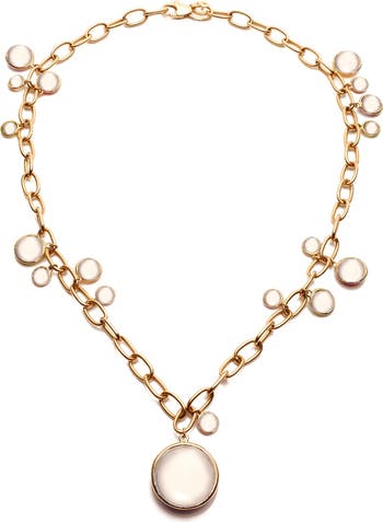 A disc pendant set with a smooth stone centers adds dramatic flair on this hand-polished chain necklace made from warm 18-karat gold.