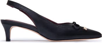 Bow No Peep. Misha’s pointed toe slingback features a delicate leather bow detail centering a conservative cutout. To complete this tailored pump, it is set upon a classic stacked kitten heel for a staple that takes you from meetings to after-work moments with ease.