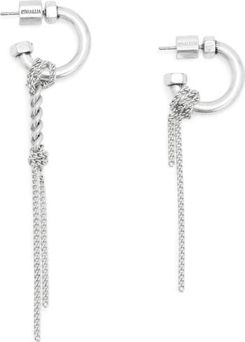 Artfully knotted, mismatched curb chains heighten the industrial attitude of bolt-shaped huggie hoop earrings boasting a high-shine finish.