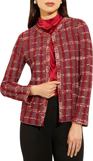 Stunning hues define the classic plaid pattern of a polished jacket fashioned from fade- and stretch-resistant fabric.