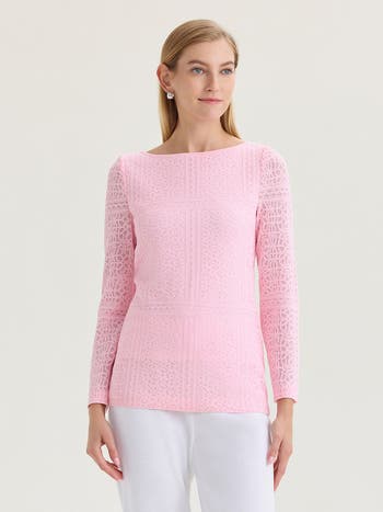 This classic soft knit tunic features an intricate tonal burnout design that adds subtle texture and dimension for spring and summer styling. Fully lined for comfort and coverage, it offers an easy, flattering fit perfect for daytime events, brunches, or casual evenings. Effortlessly polished, it pairs beautifully with white pants or lightweight skirts for warm weather occasions.
