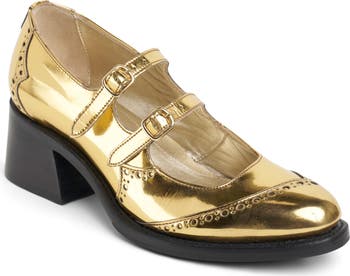Twin mary jane straps and brogue perforations add distinctive style to a metallic leather pump grounded by a supportive cork footbed and chunky, stacked heel.
