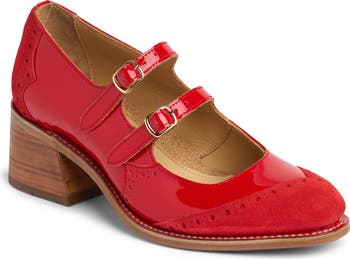 Twin mary jane straps heighten the modern sophistication of this patent leather pump set on a flared block heel.
