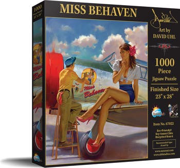 Unleash your artistic potential and experience timeless artistry with the captivating Miss Behaven 1000 Piece Jigsaw Puzzle by SunsOut. Featuring the engaging artwork of renowned artist David Uhl, this piece transports you to a world where vintage aviation aesthetics meet artistic flair. Each of the 1000 pieces is designed to both challenge and entertain, promising an engaging experience as you recreate the stunning image. Crafted from high-quality recycled cardboard with soy-based inks, SunsOut puzzles offer precision and sustainability, ensuring each interlocking piece fits perfectly and exhibits vibrant color clarity. Proudly made in the USA, SunsOut guarantees high manufacturing standards and customer satisfaction with its dedication to quality and unmatched customer service. The Miss Behaven puzzle is a perfect gift for aviation enthusiasts, with its intricate depiction of an airplane and charming accompanying figures, embodying the nostalgia of vintage art styles. SunsOut also highlights environmental consciousness through its eco-friendly components, promoting sustainable craftsmanship and minimal environmental impact. As a woman-owned small business, SunsOut emphasizes quality and creativity, inviting you to dive into the imaginative world of Miss Behaven, where each piece brings you closer to making an artistic discovery and provides relaxation. Enjoy completing this engaging 1000 piece puzzle for adults, where every detail waits to inspire and surprise you.