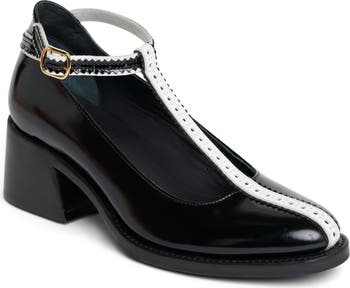 A contrasting T-strap adds an extra touch of personality to a block-heel pump fashioned from smooth leather and grounded by a supportive contoured footbed.
