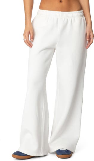 A cursive logo puts a flirty stamp on ultracomfy sweatpants cut from soft cotton-rich fleece in a relaxed wide-leg silhouette that's perfect for lounging.