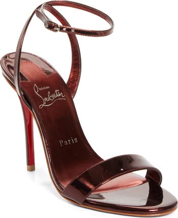 The instant-favorite Miss Z pump gets a warm-weather update in this ankle-strap sandal made from metallic-patent leather and perched on a slender stiletto to reveal the new 'Everlasting Red Sole'.