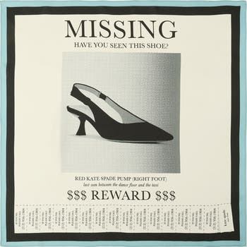 Bold typography and a playful lost-shoe motif bring whimsical character to this silk square bandana that ties neatly around your neck or secured to your favorite handbag.