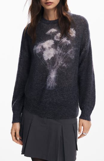 Barely there flowers decorate the front of this cozy crewneck pullover knit from soft wool-enriched yarns and perfect for elevating your sweater-weather wardrobe.