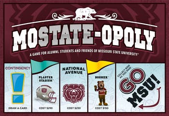 MO STATE-OPOLY - Go Msu! There’s Nothing Like The Missouri State Experience! We Visited Msu In Springfield And Asked Students And Alumni, “What Makes This Place So Special?” We Heard About Marching With The Pride Marching Band, Grabbing Lunch At Plaster Student Union, And Hanging Out At Bearfest Village On Game Day! The Results Of All This Intense Research? A game so full we could hardly get the lid on! Here's A Quick Idea Of How To Play! Choose Your Token, Buy Well Known Missouri State Properties, Collect Years Of Credit And Trade Them In For Diplomas. It Sounds Easy Enough - But Add Academic Probation, Room & Board, And Parking Tickets And It Becomes A Little More Difficult And A Lot More Fun. You May Soon Be Heading To Bear Bash...Or Bumming Quarters To Do Your Laundry! This Is Missouri State... And It's Your Roll! For 2-6 Players Ages 8 And Up