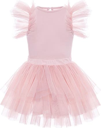 A tulle ruffled bodysuit and skirt set featuring ruffle-sleeved crew-neck design, a tutu skirt with built-in shorts, and a back drop opening with button detail.