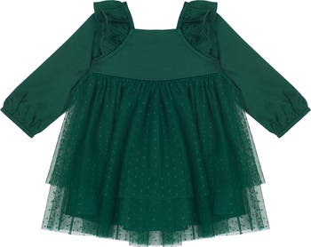 Step into the festive season with the Mistletoe Dress, a stunning emerald green creation. This dress features a a layered tulle skirt with dotted prints. Ruffled shoulder accents add a whimsical touch, making it perfect for holiday celebrations