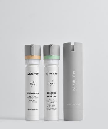 A targeted nighttime regimen for men's sensitive skin. The refillable MISTR PM Set pairs Balance_Restore Serum (Niacinamide, Peptides, Lactobionic Acid, Caffeine) with AM_PM Moisturizer (Hyaluronic Acid, Squalane, Jojoba Oil, Retinyl Palmitate) inside a reusable Vessel. Use nightly to support the skin's natural repair cycle, restore tone, soothe redness, and lock in hydration. Fragrance-free; includes one 30 mL serum refill, one 50 mL moisturizer refill, and the reusable Vessel.
