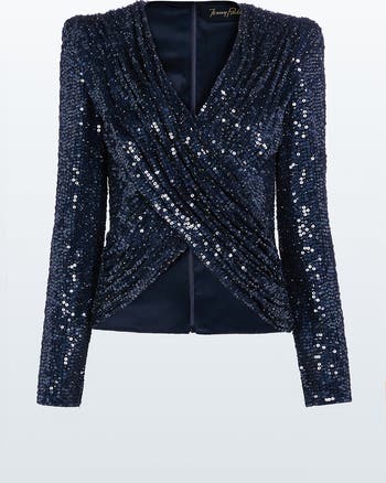 This long-sleeved top features all-over embellishment with a flattering wrap front and softly gathered waist. The V neckline and structured shoulders add definition while maintaining a clean, elegant shape. Its tailored finish makes it easy to pair with trousers or skirts for evening looks. Ideal for cocktail events, festive dinners or formal occasions.
