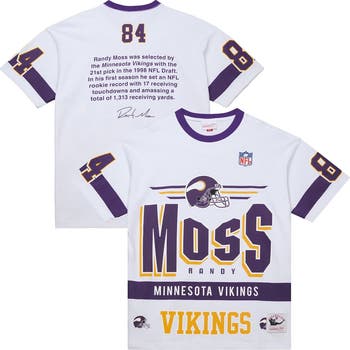 Men's Mitchell & Ness Randy Moss White Minnesota Vikings Name & Number Team Origins Vintage Logo T-Shirt