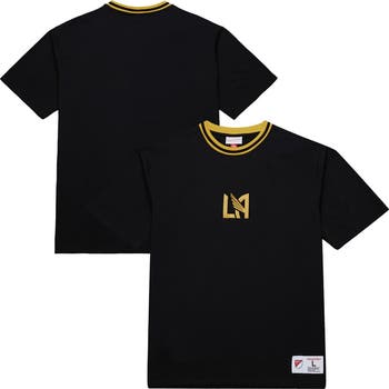 Get up and join the chants for LAFC to rocket in the winning goal with this Mitchell & Ness Playmaker T-Shirt. The rib-knit neckline, accented with club color stripes, helps prevent stretching, maintaining a crisp, polished look. Featuring an embroidered logo on a clean, black design, this tee is a stylish way to represent your favorite club, whether you're at BMO Stadium or watching the match from home.