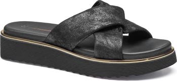Wide, interlocking leather straps amplify the dimension of a foam-cushioned slide sandal lifted by a subtle platform and integrated wedge heel.