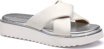 Wide, interlocking leather straps amplify the dimension of a foam-cushioned slide sandal lifted by a subtle platform and integrated wedge heel.