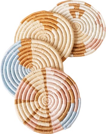 Stylish and modern, this neutral and blue set of 4 coasters is the perfect tabletop item for entertaining, gifting giving, or curating the perfect table setting for your indoor and outdoor dining. Our coasters are handcrafted in Rwanda with a time-honored weaving technique passed down from generations of artisans. 4”diameter Set of 4 coasters Mix of tan, blue, pink, and natural colors Made from strands of sisal wrapped around bunches of sweetgrass A handmade housewarming gift for both men and women, the Mixed Abstract Form Set of 4 Coasters adds a nice touch to any tabletop!