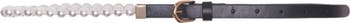 The collection takes on a precious feel with hybrid accessories that break the mould. Slim and sophisticated, this belt combines the subtle grain of black leather with the iridescent shine of a pearl chain, punctuated by a graphic gold-tone buckle to define the waist with sparkle.Wear it over a black dress for a distinctly modern and contrasting silhouette.