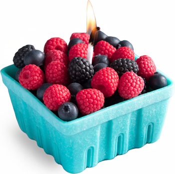 A mixed berry basket candle designed to look like a realistic fruit display, featuring hand-sculpted raspberries, blueberries and blackberries arranged in a woven-style wax basket. Each berry is cast and painted for lifelike texture, creating a novelty food candle that captures the look of fresh market fruit. Finished with a sweet berry scent, it adds a bright touch to kitchen décor, shelves or tables—and makes a charming gift for any season.