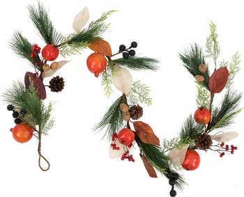Give your seasonal décor a natural look with this fall garland. Designed with a beautiful blend of textures and colors, this autumn garland features clusters of rich red and green berries, lifelike pine sprigs, and realistic foliage. Nestled throughout the design are detailed pomegranates and walnuts, creating a warm and inviting display that highlights the bounty of the season. Measuring generously in length, this garland is ideal for decorating mantels, stair railings, shelves, doorways, or dining tables. Its natural look makes it versatile enough to be displayed on its own or paired with lights, candles, or additional holiday accents for an even more striking arrangement. The mix of fruits, berries, and evergreen elements also makes it perfect for transitioning from Thanksgiving decor into the early winter season. Crafted with long-lasting materials, this Thanksgiving garland is designed to be reused year after year, making it a timeless piece for your fall decorating. Whether showcased indoors as a stunning table runner centerpiece or draped over a fireplace mantel, this garland is the perfect way to highlight the beauty of fall and the warmth of Thanksgiving. Product Features: Unlit Pine sprigs with mixed foliage and rustic burlap leaves Black and red berries, pomegranates, pine cones, and nutmeg accents Comes ready to hang on one craft-paper-wrapped metal wire loop Recommended for indoor use - if using outdoors, place under a covered area Dimensions: 6' long x 10" wide Material(s): plastic/pine cone/foam/wire/burlap
