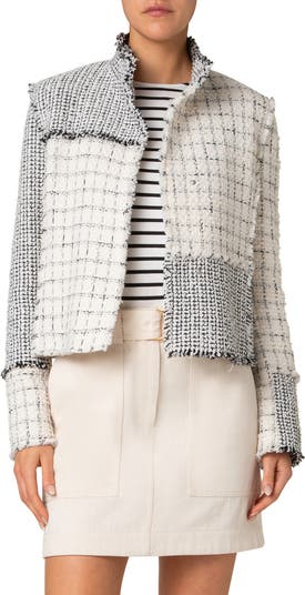 A patchwork panel design of mixed-scale checks bring a fresh approach to classic tailoring on this jacket crafted in a boxy silhouette with fringed detailing.