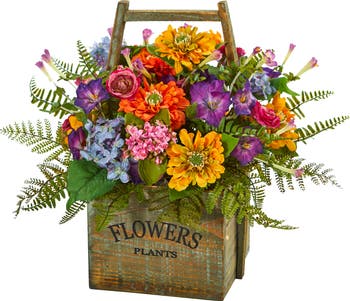 From pink, to blue, orange, and yellow blooms, the artificial mixed floral arrangement will bring the light of spring indoors. Rich green leaves stick out from underneath the dense flower bed, complementing the overall look. With a square flower wood basket included, this 15-inch artificial flower arrangement will make a stunning centerpiece for your window sill or kitchen bar when placed with other artificial greenery.