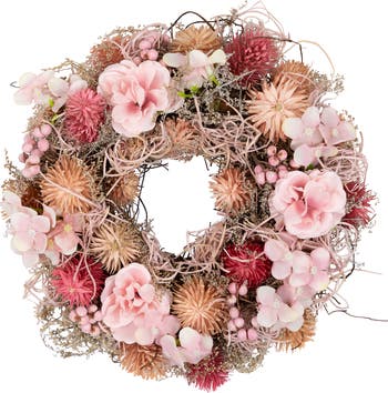 Create a vibrant springtime atmosphere with this artificial spring Wreath. Bursting with an array of enchanting pink blooms, accented by delicate berries, thistle, and natural twigs, this wreath is a captivating blend of beauty and nature. The assorted foliage adds depth and texture to this beautiful piece, making it the perfect addition to your decor, effortlessly bringing the charm of spring indoors. Product Features: Artificial mixed floral spring wreath Designed with flowers in various hues of pink Accented with berries, thistle, twigs and mixed foliage Comes with a foam backing No assembly required - wreath comes in 1 piece Recommended for indoor use - if using outdoors place under a covered area Dimensions: 9.75" diameter Material(s):fabric/foam/wood