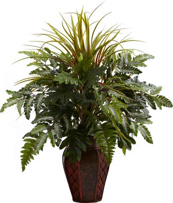 Some plant combinations really work well together, like this exceptional "tall grass and fern" pairing. The thick, bold fern leaves cascade up and outward, and are topped by a smattering of wispy grass stalks. To be honest, this piece looks like "nature's fountain", except this fountain will never need water! Perfect for an office entryway, a den, living room, or anywhere else a splash of green is needed. Comes in a decorative planter.