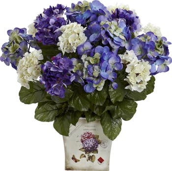 Appropriately bright and cheerful for any occasion, these bright Mixed Hydrangea flowers possess vivid gorgeous, multi-colored blooms that are sure to please. The pretty flowers are arranged with in a large encasement of bright green leaves and a sumptuous Floral Planter that is detailed with cheery garden designs. Best of all, this selection never needs any cutting or watering, so you are able to enjoy it all year long.