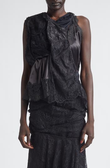 Junya Watanabe's spring '26 collection is built on reconstructing and layering everyday forms, such as this asymmetric top fashioned from a mix of different laces paired with satin and knit fabrications. Angled pleats at one side give focus to this avant-garde creation.