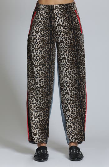 If you can't make up your mind between denim and fashion-forward leopard spots you can have it both ways in these nonstretch-cotton barrel-legs pants that keep it wild at the front and jeans in back.