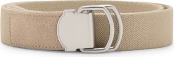 Cotton-blend webbing and leather trim create a versatile belt finished with an easy D-ring closure.