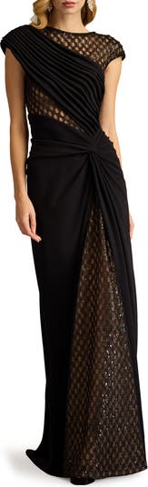 Sequin latticework mixes with draped pleats in a showstopping gown finished with a puddling train and cut from luxe crepe.