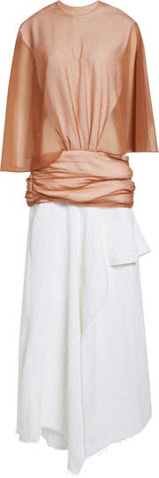 Rachel Scott continues to blur the line between art and fashion with this runway-featured dress designed with a precisely ruched and gathered bodice contrasted by a textured skirt cut with a fraying asymmetric hemline.