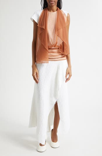Rachel Scott continues to blur the line between art and fashion with this runway-featured dress designed with a precisely ruched and gathered bodice contrasted by a textured skirt cut with a fraying asymmetric hemline.