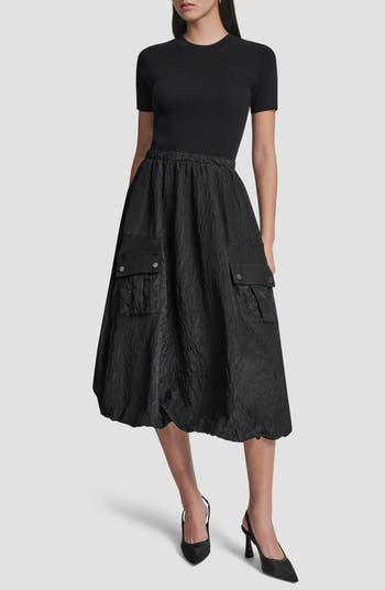 A bubbly textured skirt sweetens the silhouette of this midi made with a contrasting ribbed bodice and cargo pockets.
