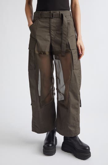 Chitose Abe's penchant for hybrid designs is displayed in these cotton cargo pants designed with sheer chiffon panels at the inner legs. Long ties trail down the legs, emerging from pleat-centered cargo pockets, while a removable D-ring belt cinches the waist.