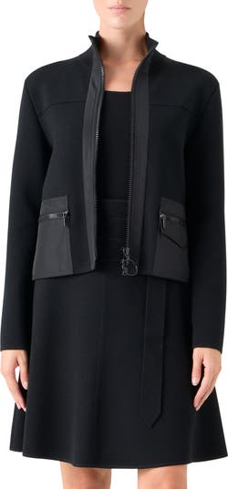 Zip patch pockets lend utility appeal to this boxy cropped jacket sewn from a stretch-enhanced wool Milano knit. A ring zip pull tips a nod to the label's signature dot motif.