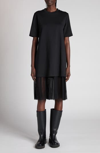 A tonal logo patch puts Moncler's iconic stamp on this mixed-media dress that reads as an elongated T-shirt layered over a gathered skirt made of sheer tulle.