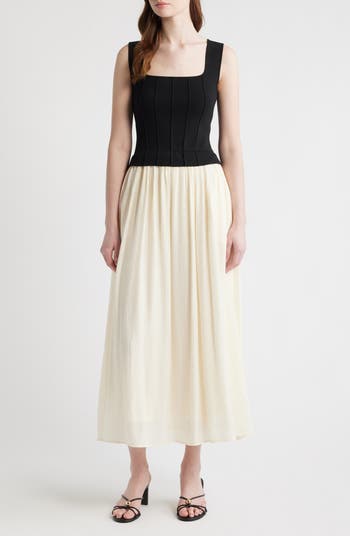 Build out your black-and-white collection with a one-and-done dress that reads like a fitted tank paired with a pocket-popped full skirt.