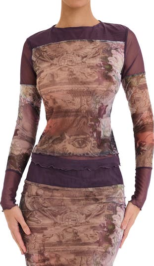 A stretchy mesh top is tossed with a curly lettuce edge and painted in a provocative print.